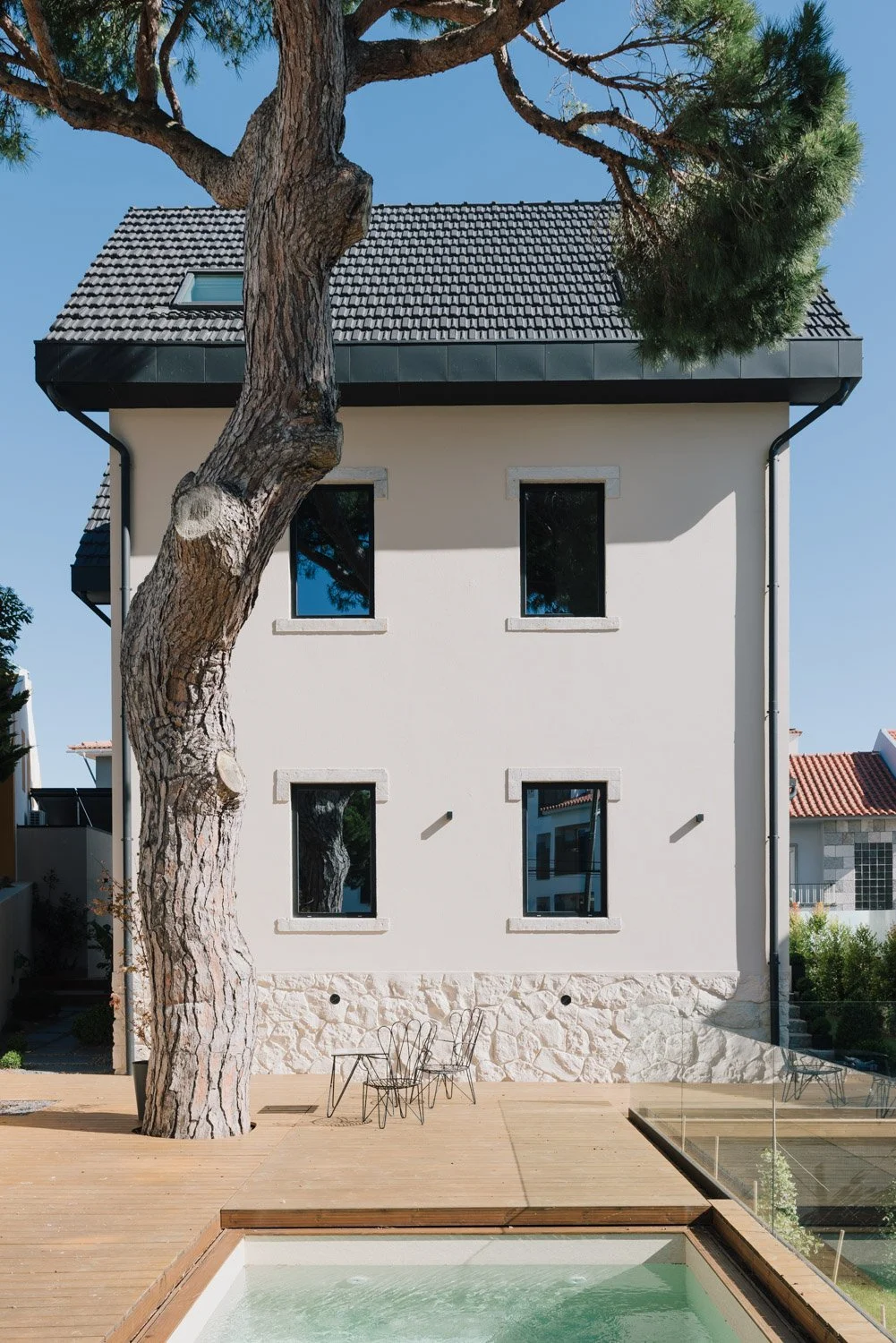 When you go up to the upper floors, you will find suitably qualified suites with the windows of the existing facades, and with all the amenities and storage necessary for the comfort of our days. Upon reaching the top floor, the attic, there is a large open area, suitable for different uses, and a last suite. All bathrooms are designed with bespoke materials. In the new sloping roof, redone with new technologies and insulation, new windows were open, framing the beaches of Estoril to the south, and for the Sintra mountains to the north.